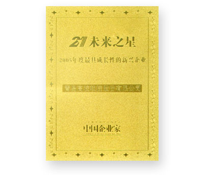 “未來之星”是中國年度最具成長力新興企業(yè)的杰出代表,《中國企業(yè)家》雜志自2001年開始推出“未來之星——最具成長性的新興企業(yè)”評選,五年來共有105家企業(yè)獲此殊榮。每屆評選出的21家“未來之星——最具成長性的中小企業(yè)”,它是從近2000家推薦的中小企業(yè)中,由知名企業(yè)、高等院校和政府等各領(lǐng)域的專家、教授根據(jù)企業(yè)的行業(yè)地位、成長性、創(chuàng)新性等指標(biāo)評選出在各行業(yè)中最具活力的新興企業(yè),由于其評選的嚴(yán)肅性、科學(xué)性,因此在業(yè)界極具影響力。