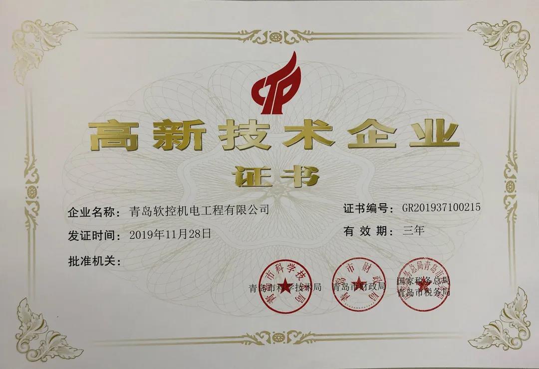 近日,青島軟控機(jī)電工程有限公司榮獲青島市科學(xué)技術(shù)局、青島市財(cái)政局、國家稅務(wù)總局青島市稅務(wù)局聯(lián)合下發(fā)的《高新技術(shù)企業(yè)證書》,這是繼2016年初次獲評后,軟控再次獲此殊榮。